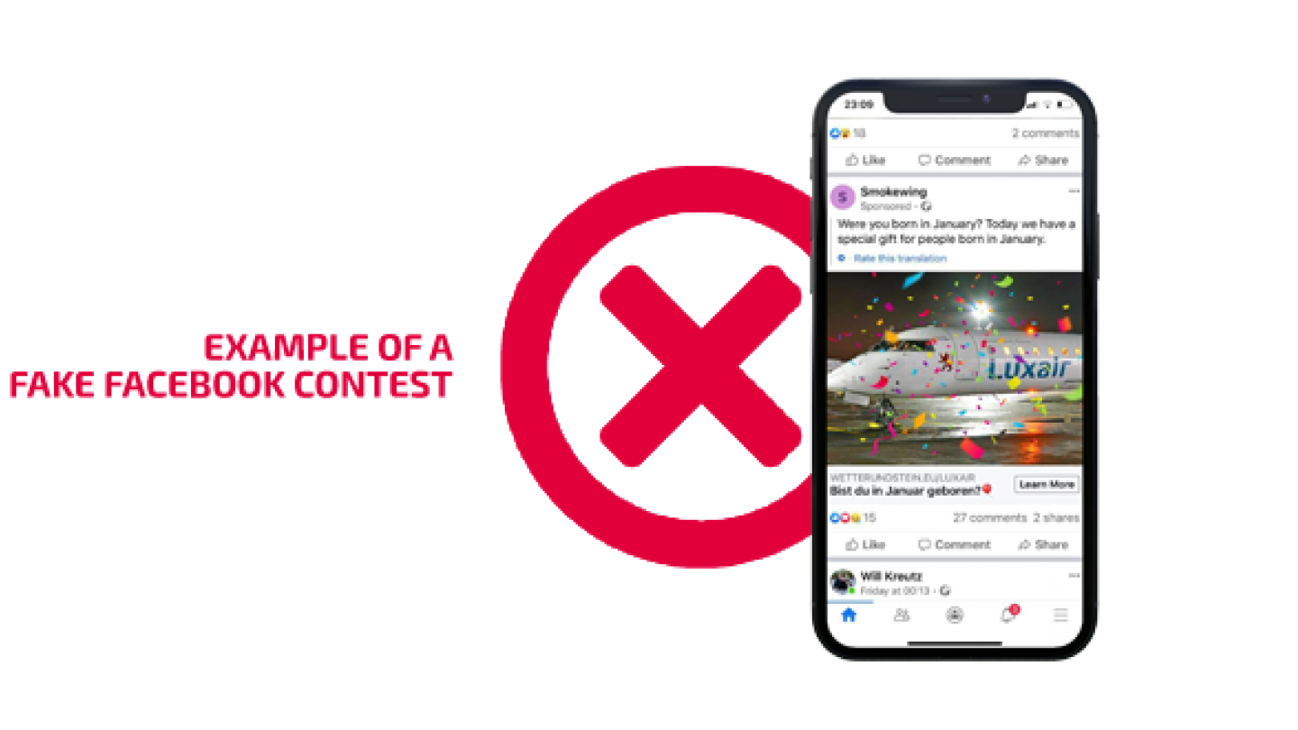 1 - The host account: genuine Luxair Luxembourg Airlines social media contests are only hosted on Luxair Luxembourg Airlines social media accounts or trusted partners' accounts such as radio (LOR FM, RTL, DirectFM, etc.), airports, press and press websites (L'essentiel, RTL, etc.), third-party companies (POST, Spuerkess, etc.), bloggers. This list is non-exhaustive. Fake contests usually take place on unbranded pages with random names (no profile picture / the profile picture contains just the first letter of the page title).