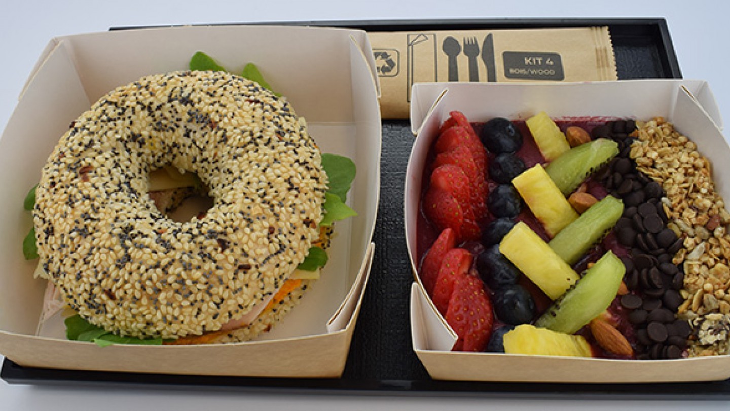 Desfrute de uma reconfortante refeição de 3 pratos que inclui um bagel vegano, seguido de fruta e cereais. (1a,1c,1d,6,8a,9,10,11,12*)